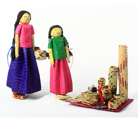 Muñecas que representan a vendedoras de palma, obras tejidas y teñidas por ellas mismas; como aventadores, tascalitos, petates, atrapanovios y animalitos miniatura