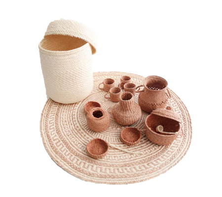 Juego llamado “Co´hox ba´xaa” Vamos a jugar, 17 piezas miniatura tejidas con palma llamada Jipi Japa, tapete y tenate para contenerlos.